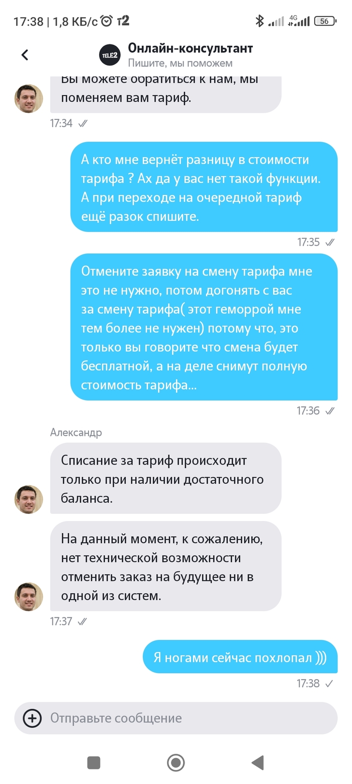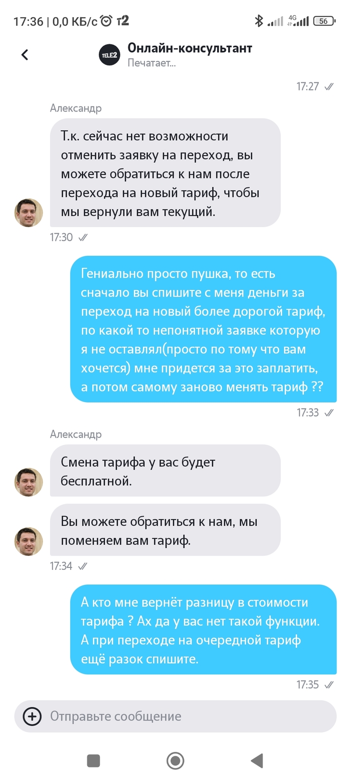 Только что запланировала поездку в авто, все в привычном режиме, но внезапно пропадает интернет, а на телефон приходит сообщение от теле2 о том что мне необходимо дополнительно подключить услугу раздачи интернета за 30 рублей в сутки. ЧТО???? Что блять???? Это что ещё за такое новшество??? Я впервые вообще слышу что это может являться дополнительной услугой! То есть я купила у вас интернет, и не могу использовать СВОЙ оплаченный интернет так как посчитаю нужным??? Окей, вы придумали эту залупу, но тогда вы предупреждайте об этом нормально, точно так же большими буквами на главном экране в списке тарифов, а не в разделе "информация" где куча вкладок, которые нахрен никто не изучает досконально. Если бы я увидела этот пункт, то, разумеется, я бы не перешла на этот тариф. В службе поддержки очень пассивный оператор посоветовал сменить тариф снова, то есть мне снова нужно оплатить его! Да вы охренели??? Я, блять, товар в магазин могу вернуть если он мне не понравился, и получить назад свои деньги, а оператор ответил лишь "мне жаль, но я ничем не могу помочь".