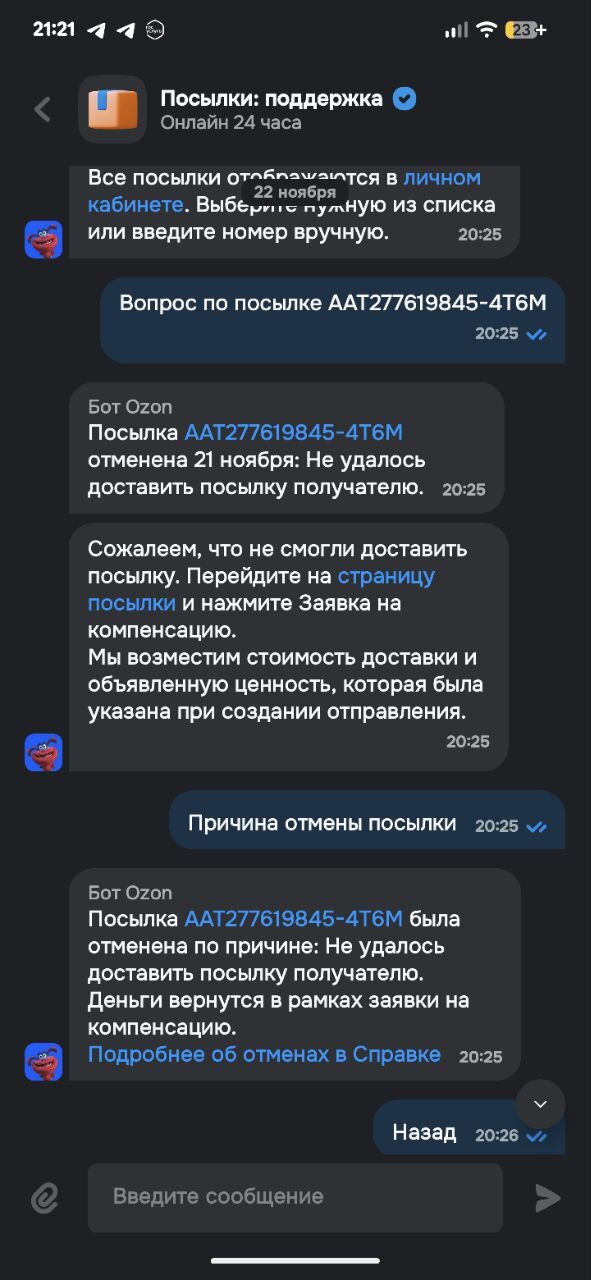 Итак, нужно было отправить товарищу топовый объектив Nikkor 17-35mm f2.8, почта РФ работает крайне в неудобное время да и озон удобнее, да реально ж удобнее принести посылку в ПВЗ без очередей и до 21 часов после работы. Стоимость отправки маленьких посылок ерундовая, 99рублей - тоже подкупает. Да, понимаю, надо было делать страховку - задним числом теперь понимаю ненадежность ОЗОНА, но как-то было полное доверие к крупной компании, да и предыдущий опыт радовал. Посылку приняли, сделали снимки, наклейки и пошло время. №AAT277619845-4T6M . Трекинга нет, остается терпеть. и тут опа- сообщение, что "посылка отменена". Ни честное "мы проебали посылку", ни вежливое "извините, посылка была утеряна", а просто отменили. Вот бы шумных соседей отменить. Или зиму отменить, а то что она. Отменена. Удобный термин какой.