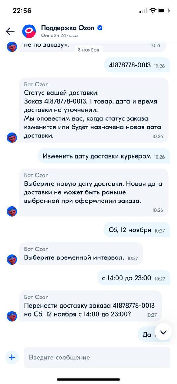 Несмотря на то, что пост был прочитан, тоже решились на покупку с озон доставкой, но только не дивана, а духовки. Изначально заказ был сделан на 6 ноября. Не буду особо говорить о временном окне ожидания курьера в 9 часов (с 14:00 до 23:00). В указанную дату уже в восемь вечера решили уточнить, всё ли в порядке, в чате подтвердили, что можно ожидать.