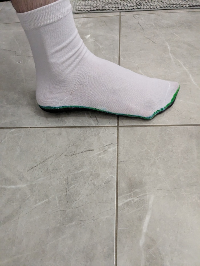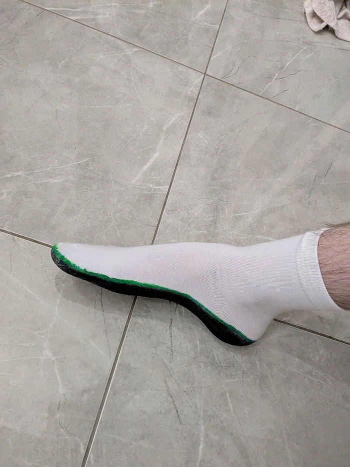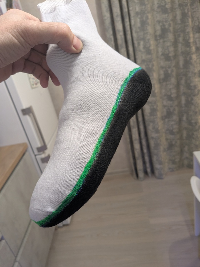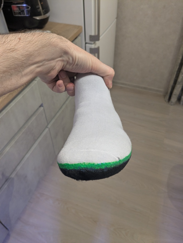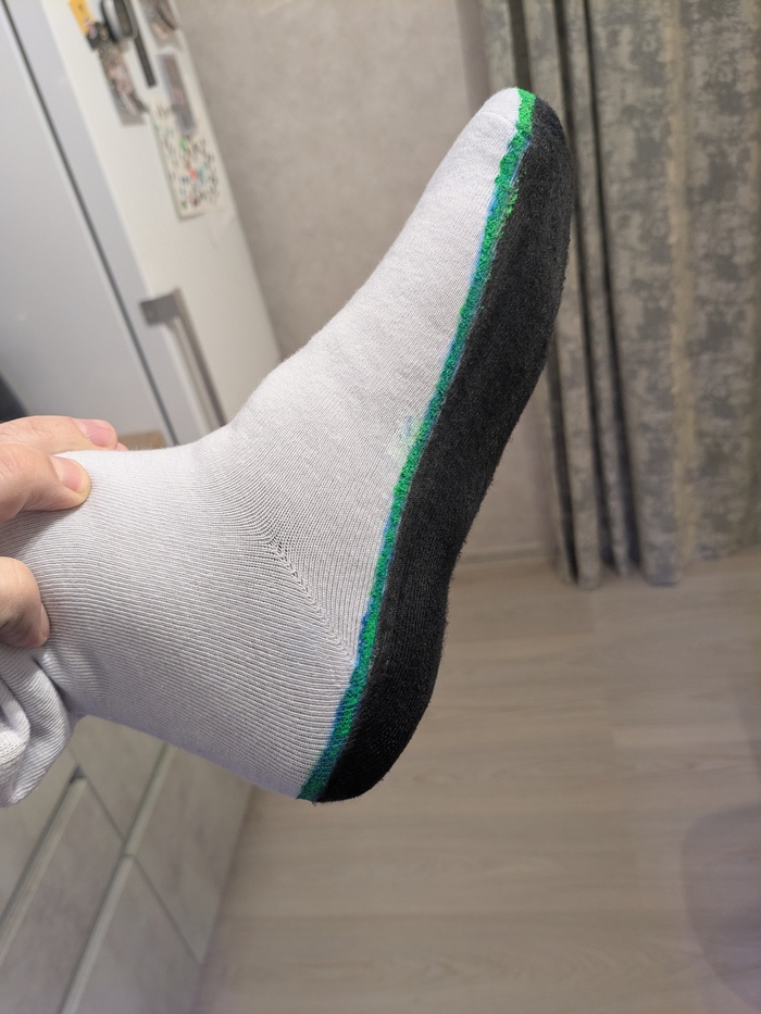 Через сутки сушки я прогладил носок и первый раз надел: во-первых, в некоторых местах краска была прям слишком толстая, на изнаночной стороне был видны ее пятна и во время ходьбы немного прилипает к полу - возможно, после стирки это пройдёт. Во-вторых, носок как будто стал меньше и хуже тянуться - это я связываю с тем, что краска зафиксировала стопу в том размере, что я смог накрутить на манекене, т.е. меньше, чем моя. Из-за этого линия и черная часть оказались не совсем там, где я планировал и неоднородны в плане цвета.