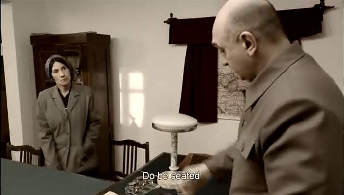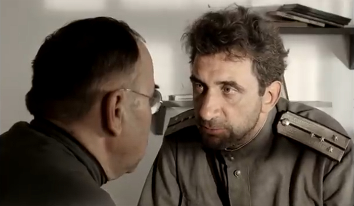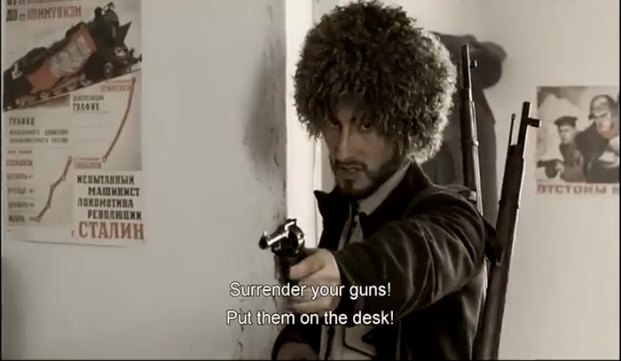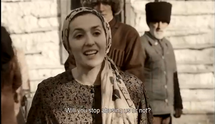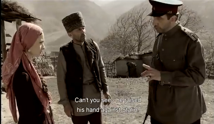 Дикие злобные русские, за то что арестованный разговаривает, бьют его винтовками по спине. Опять контраст, гордая чеченская женщина, которая отказывается подписывать ложный донос. И злобные русские варвары, которые принуждают мужчину подписать документы, при этом избивая его. А почему бы тогда режиссеру не рассказать про многочисленные чеченские банды, которые занимались убийствами и грабежами?