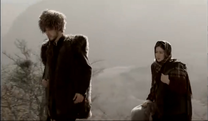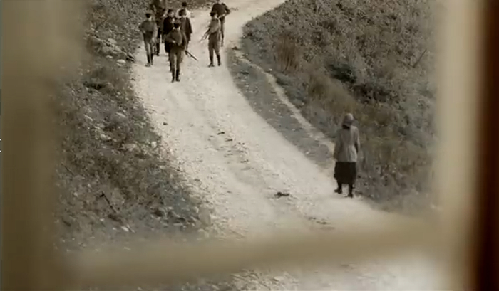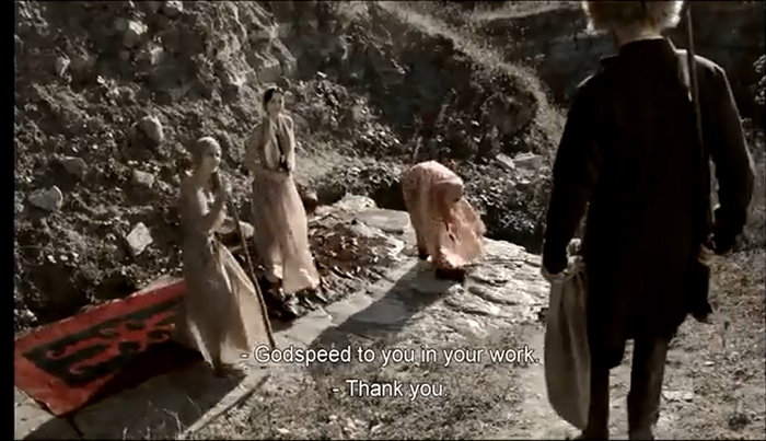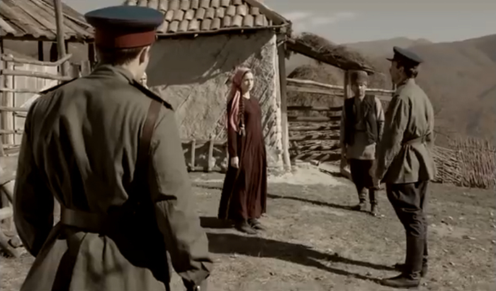 Далее нам показывают, как старики над могилой женщины читают молитву, ну а злобные русские по дороге ведут арестованного муллу. В следующем же кадре нам показывают, как два злобных упыря из НКВД ведут по дороге Райхан, наставив на неё винтовки.