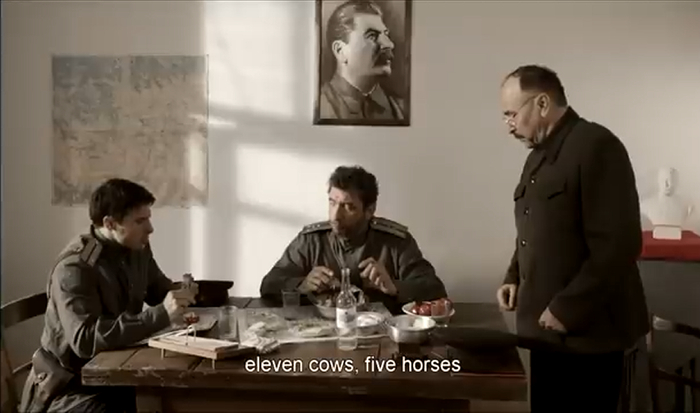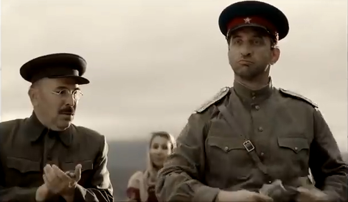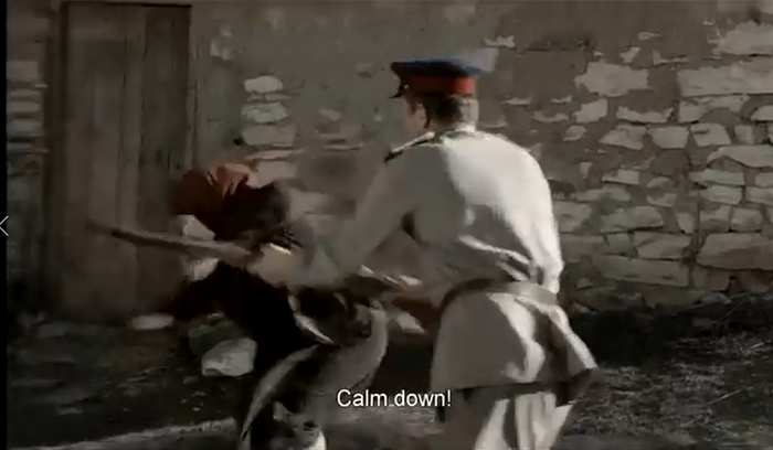 После чего, как и положено коммунистам в современных российских фильмах, Касим грубо хватает девушку за руку, ведет её в сарай, но получает пистолетом по голове и падает на землю. Отец девушки стреляет по Касиму, ну что бы он лежал, убивает одного русского упыря, который в него начинает целится.