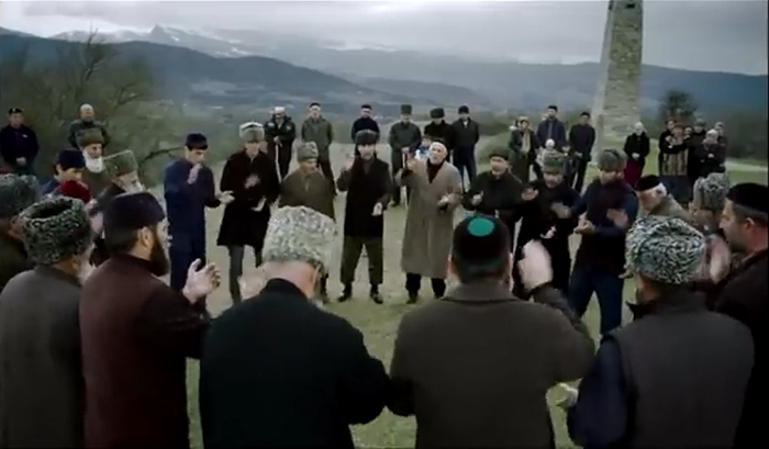 Фильм начинается похоже в наше время. Где то в горах, группа чеченцев разного возраста, что то отмечает, скачут на одном месте, выкрикивают одну и туже фразу и хлопают в ладоши. Что это за праздник я не берусь судить, так как не являюсь знатоком чеченской культуры.