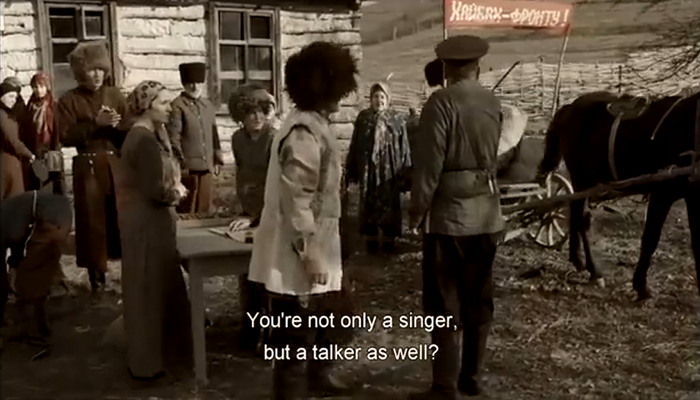 Извиняюсь конечно, нам тут показывали в разных кадрах, массу молодых мужчин, вполне себе призывного возраста, а эти то почему не на фронте? Или это не настоящие мужчины? Девушка спрашивает, кто вообще такой Касим, какого он роду племени. Касим говорит что он коммунист и сын коммуниста и он защищает Родину.