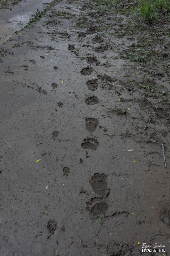 Первые следы мишки были обнаружены всего в полукилометре от пасеки, где я всё это время отдыхал. Следы свежие хорошие, прямо на дороге, в кустах их, конечно, не найдёшь.