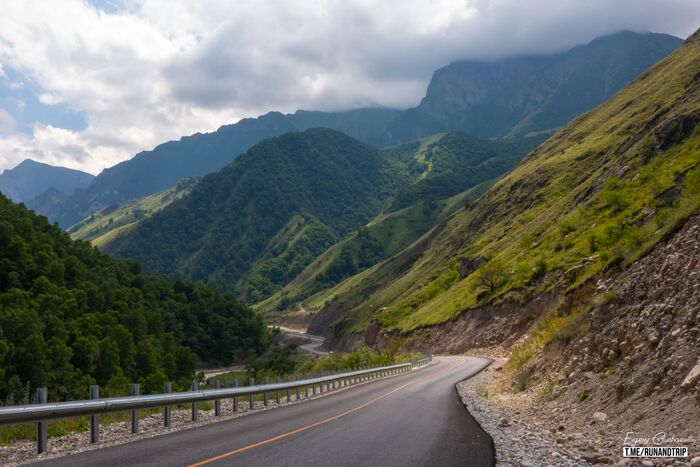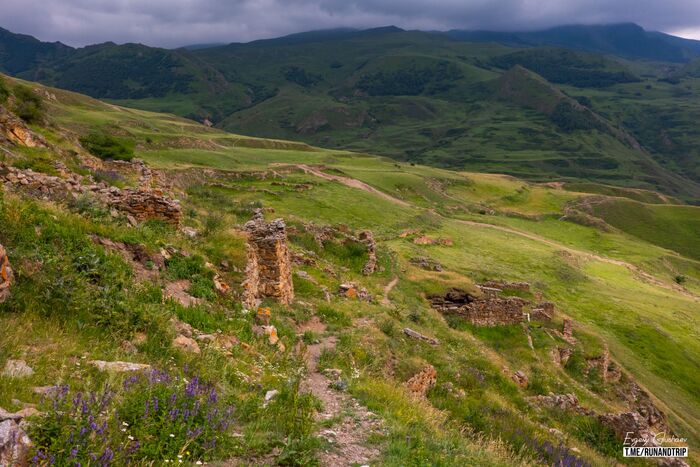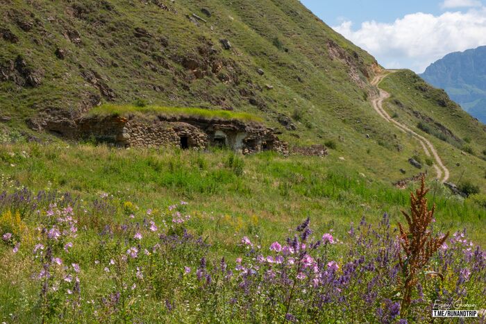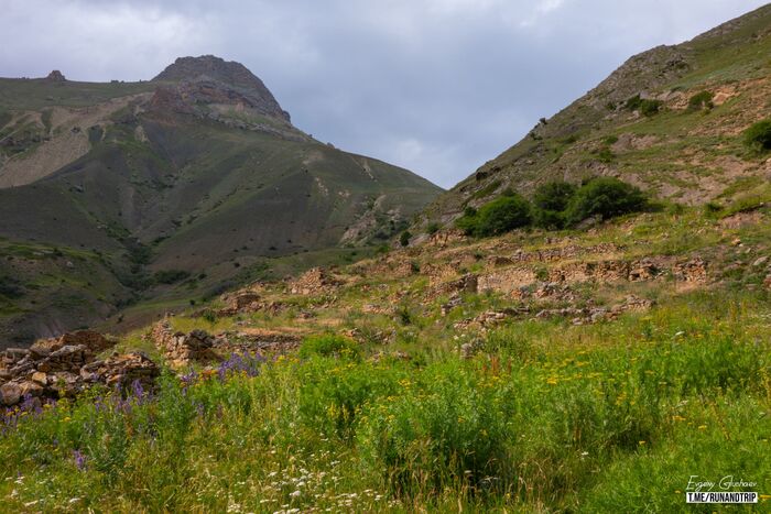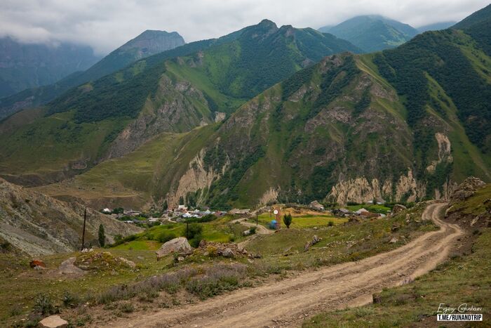 С руин дорога снова ведёт на перевал. Возможно есть тропа, которая более удобным способом соединяет эти два перевала, но я её возможно пропустил из-за плясок с GPS. По автомобильной же дороге не заблудиться был куда проще, но идти чуть подольше. По пути ни одной машины, к этому уже давно привык. Как пост апокалипсисе есть дома и дороги, но нет ни единой души и погода такая тяжелая, дождевая, давящая. Это особенно сильно беспокоило меня, ведь дорога шла в перевал и уже накапывал мелкий дождь. Ещё крепки воспоминания о ночевке в грозу на перевале под Эльбрусом!