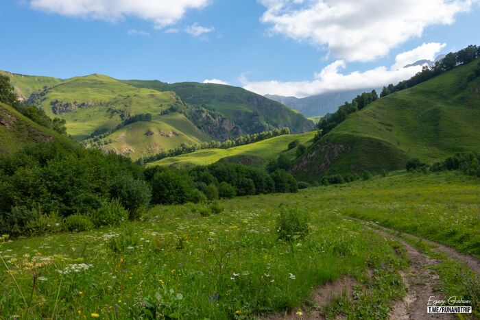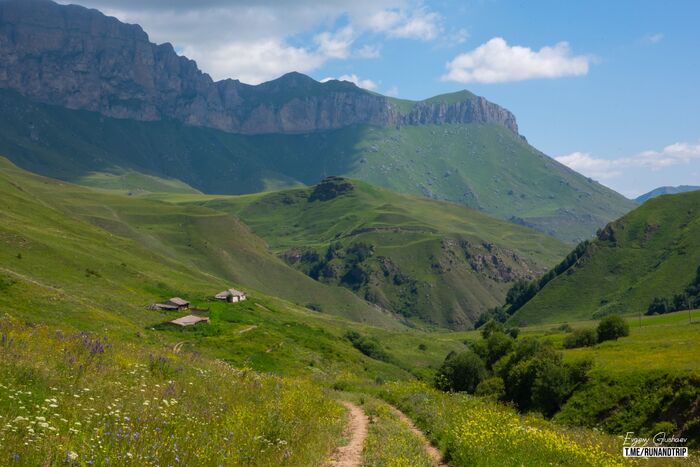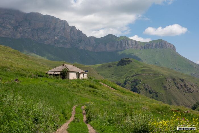 Благо, что весь путь по дороге, да не просто дороге, а по дороге с травкой. Идти одно удовольствие! Вокруг птички, цветочки, кучерявые облачка скрывают жаркое солнце! Красота, да и только. Иди и наслаждайся, пугалку от медведя далеко не убирая. За небольшим перевалом попался большой КОШ.Явно обжитой, но хозяина дома не было. Возможно он выгуливал по лугам скот. На домике спутниковая тарелка висит. Цивилизация! живёт тут отшельником вдали от каких-либо населённых пунктов. Тут включаешь песню КИШа “Лесник” и идёшь дальше.