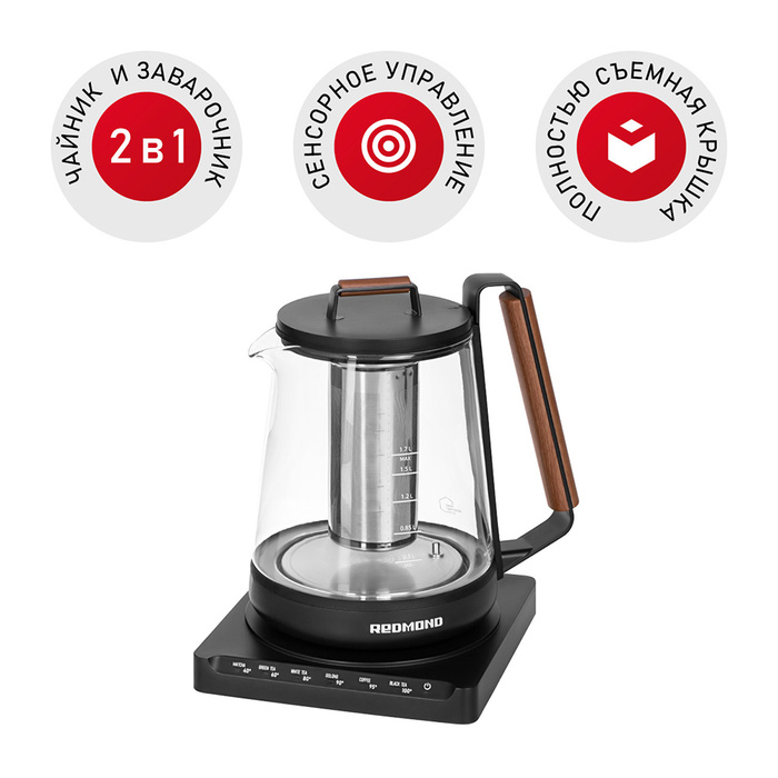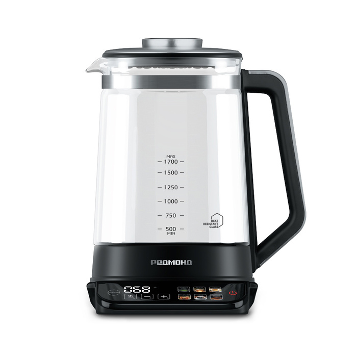 Электрический чайник REDMOND RK-G1308D – это современное решение для тех, кто ценит не только стиль, но и функциональность. Его мощность 1350-1500 Вт и объем 1,7 л позволяют быстро вскипятить воду для всей семьи, а шесть температурных режимов (от 40 до 100°C) делают его универсальным прибором для приготовления не только чая, но и других напитков. Удобное электронное управление и индикация работы с помощью светодиодов обеспечивают легкость в использовании. Чайник оснащен системой автоотключения при недостаточном количестве воды, закипании или снятии с подставки, что повышает безопасность эксплуатации. Материал корпуса – прочный металл, а нагревательный элемент выполнен из высококачественной нержавеющей стали, что гарантирует долгий срок службы и устойчивость к образованию накипи.