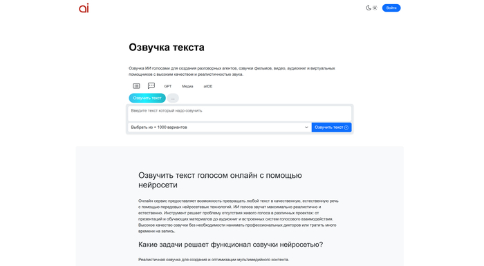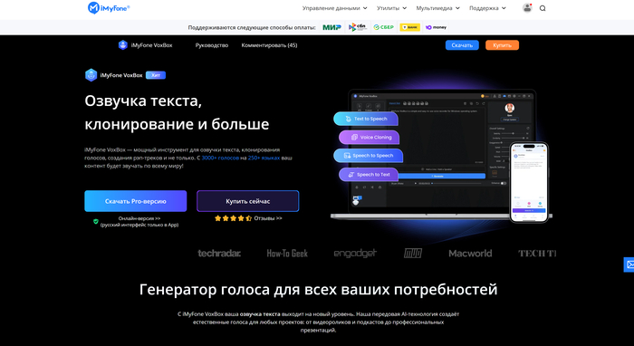 • Озвучка текста на русском и 150+ языках — голосовой синтез с поддержкой множества языков и акцентов.