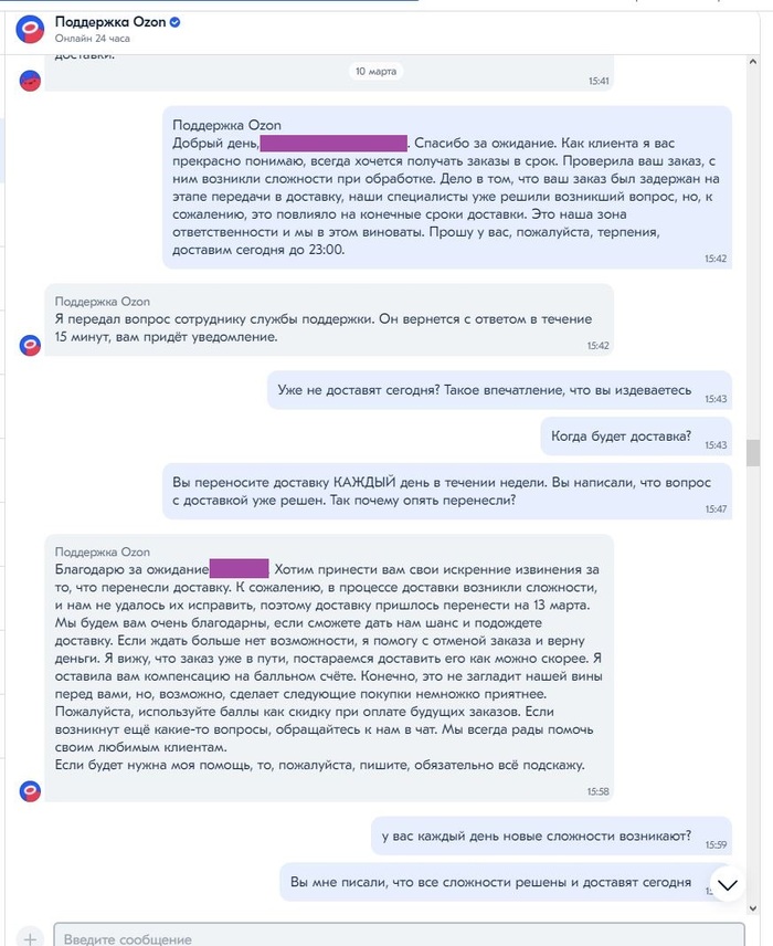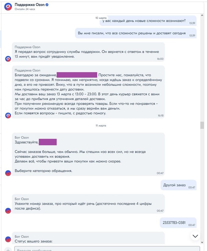 Стоит отметить, что представители Озон в чате сознались в том, что они сами виноваты в недоставке товара. Таким образом, их ответы о том, что они агрегаторы (даже если "отбросить» факт того, что получателем денежных средств был Озон), и не отвечают за отмену заказа со стороны продавца выглядит комичным, что, в свою очередь, подтверждает факт того, что претензией не занимались, а только лишь понапихали туда стандартных фраз.