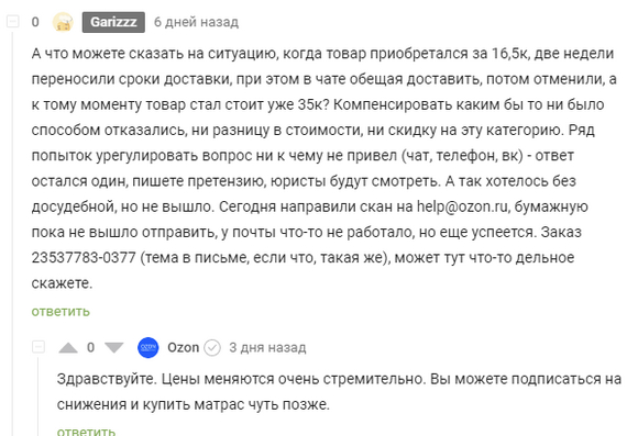 p.s. для тех, кто скажет, нечего там заказывать, ежики кололись, но продолжали есть кактус, утром стулья – вечером деньги и тд, скажу, что Озон (как и другие маркетплейсы), как ни крути, является удобным местом приобретения различных товаров, и у всех свои привычки, которые менять не всегда хочется. Кто-то любит ходить по магазинам, я же привык заказывать 90% товаров онлайн. Но это совершенно не означает, что подобные случаи стоит им спускать с рук.