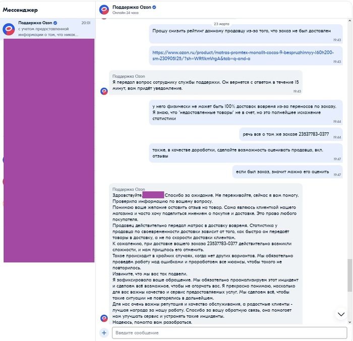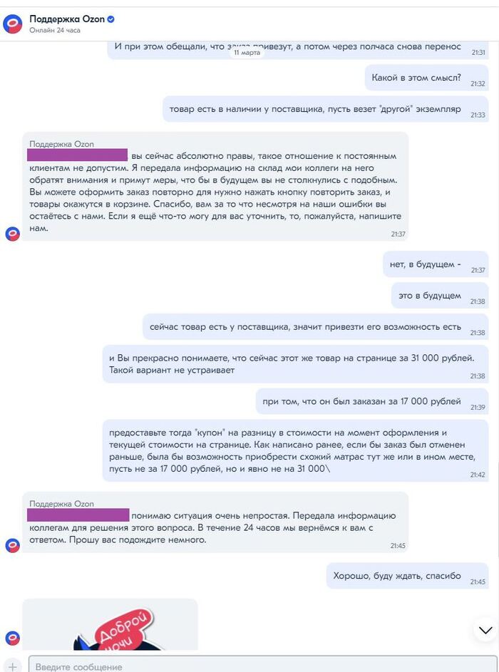 Еще интересная вещь, что при попытке написать вопрос продавцу, причем не важно какой, по доставке, просто спросить о товаре, он может просто проигнорировать, а Озону на это до лампочки.