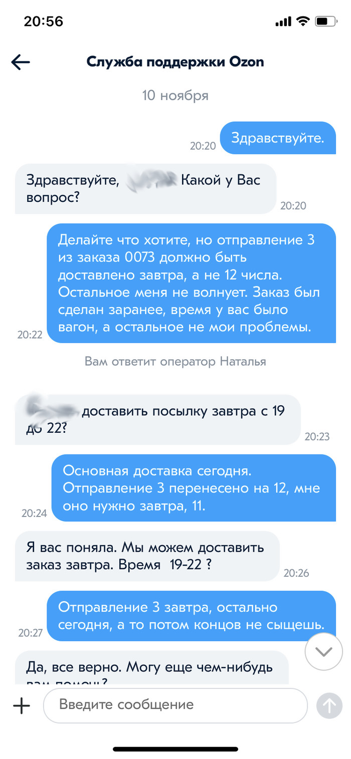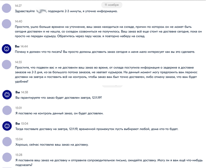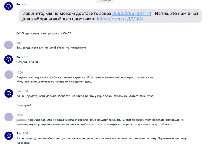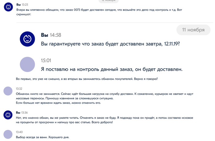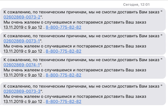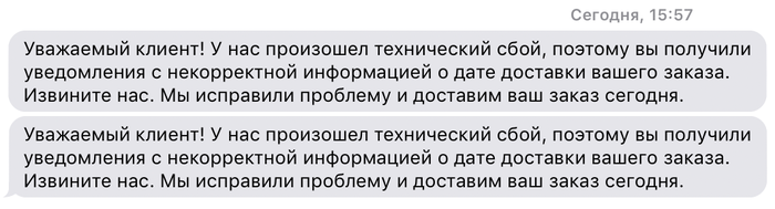 И вдруг после нашего общения, мне приходят СМС, о том, что другие сообщения (!!!) об очередной отмене доставки – это техническая ошибка: