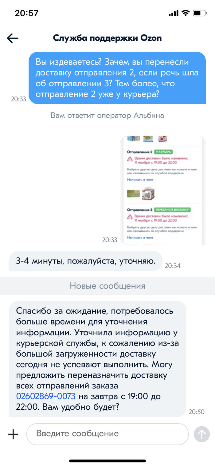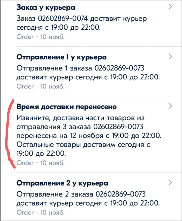 Оператор изменила дату доставки не только той части заказа, которую они не смогли привезти, но и у той, которую уже выдали курьеру! Это мне не понравилось: