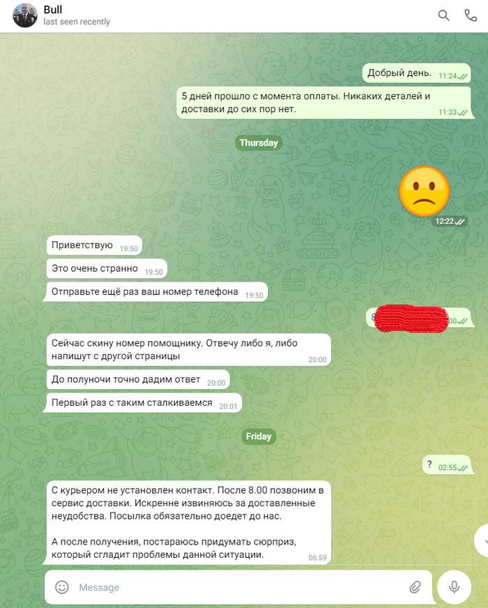 Я был даже не особо расстроен введением «Премиум»-подписки, полагая, что за эти деньги получу не только бесплатную доставку на каждый чих, а ещё приоритетное обслуживание. Но это были лишь радужные мечты. После нововведений я делал несколько заказов, в основном всё проходило нормально, было пару переносов на день, один заказ переносили 2 недели, но он был для меня и не к спеху, поэтому я особо не расстраивался. Как-то покупки принесла девушка, вся в пирсинге и татуировках, которой, вдобавок, очень хотелось в туалет. Ну а я расскажу о последнем случае, который меня выбесил и удивил.