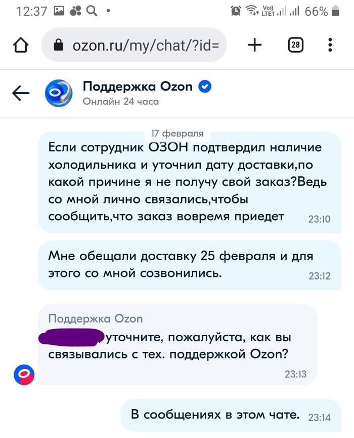 В ответ на обращение в тех.поддержку, мне приходит лаконичный ответ, мол сообщайте всё смело, зуб даём это сотрудник компании ОЗОН звонил. Сильно я тогда удивилась, но хлопец подтверждавший доставку так и не перезвонил и вечером пришло сообщение, что мой заказ отменён. Я обратно в тех. поддержку, мол господа как же так, ведь Ваш сотрудник звонил и доставку подтверждал, а мне в ответ мол фрау, Вы не в себе, это мошенник был. Мы здесь не при делах.