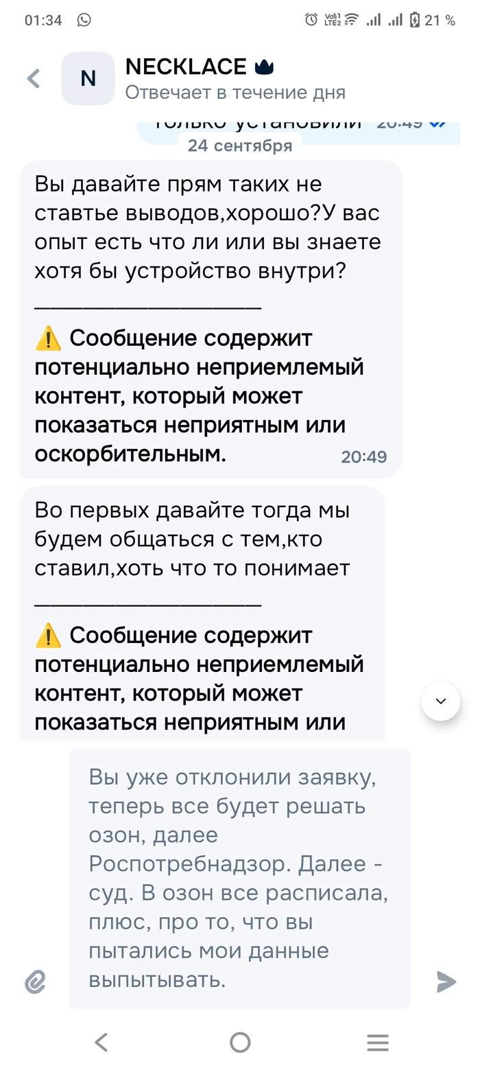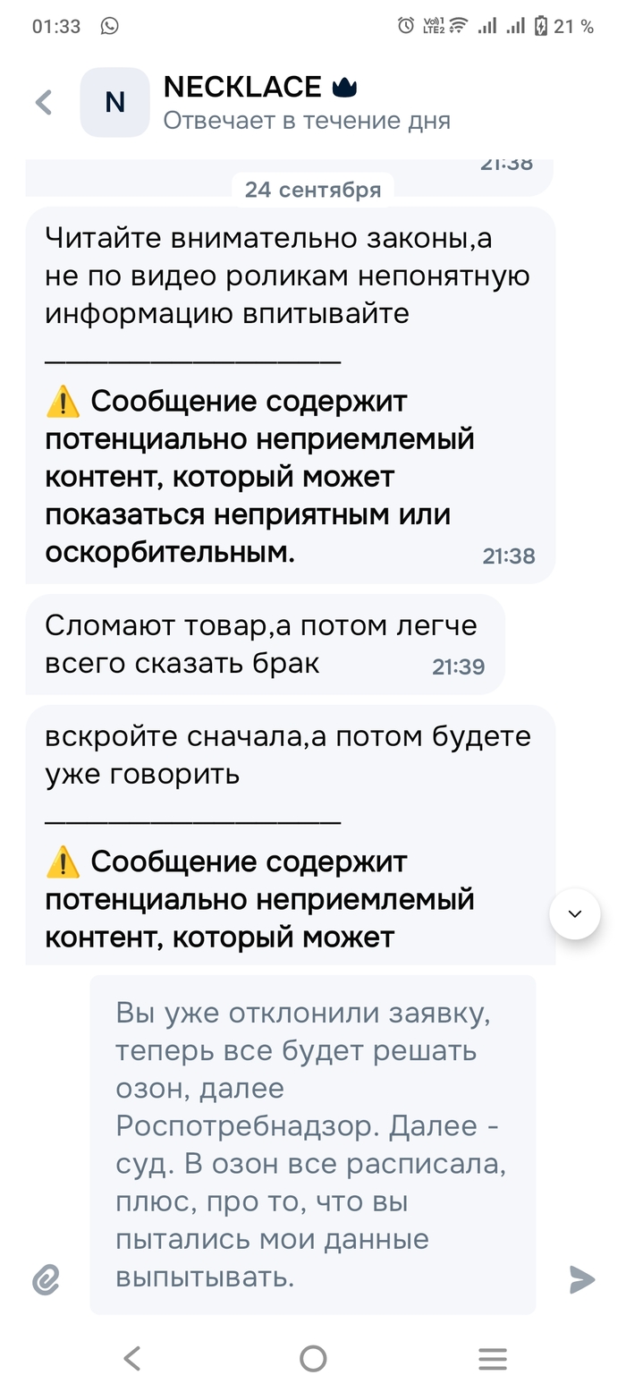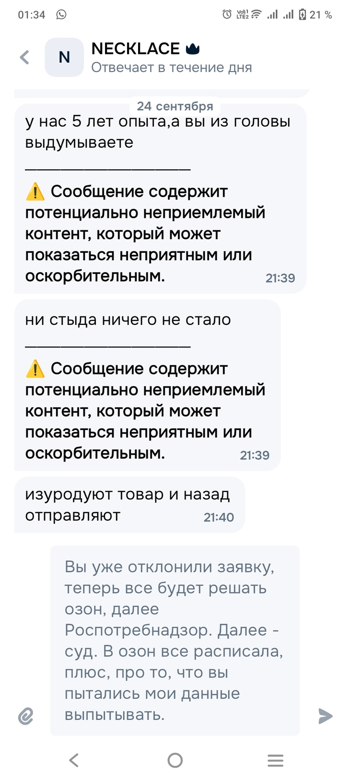 И OZON: Вы беспринципные уроды, обманывающие своих покупателей в сговоре с мошенниками размещающими у Вас свои фэйковые товары. Работа Ваших сотрудников службы технической поддержки пользователей, прямое тому подтверждение. Это ведь вам не на Ав... по 3000-5000 р. с лохов собирать, тут с каждого минимум по тридцаточке сразу прилетает.