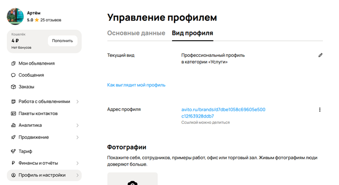 Текущий вид - профессиональный профиль в категории "Услуги".