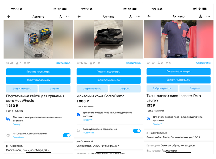 Крайний раз 3 июля поступает запрос на доставку по обуви - моим кожаным мокасинам. И снова не могу отправить. Пошёл по всем товарам. Не могу отправить даже несколько тюков с тканью, которые ранее у меня дважды заказывали в 2022 году с помощью доставки.