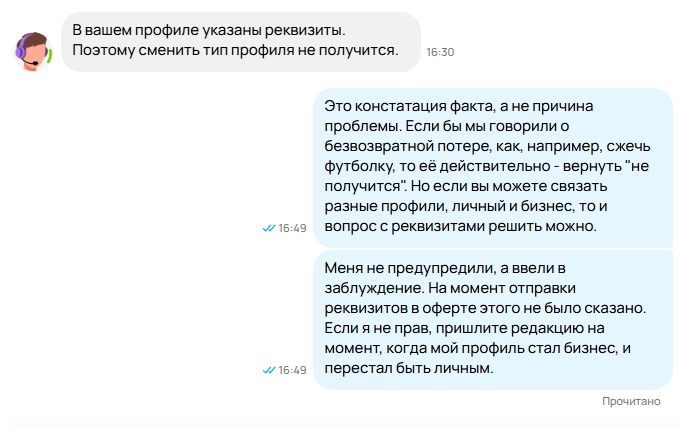 Я эту логику не понимаю. Попросил предоставить редакцию оферты на момент заполнения реквизитов юрлица для услуг, из которой следует, что подключение Про в услугах влечёт за собой распространение и на профиль с товарами, то есть на личные вещи. Пока такого не получил.