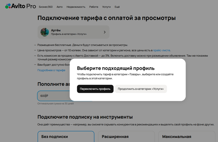 В разделе подключения тарифа мне предлагается продолжить в категории "Услуги". Окей, пусть Про будет для бизнеса, но мои личные мелкие товары-то зачем пихать под бизнес?