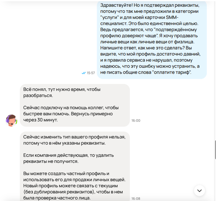 - Теперь чтобы мне продать ношенные вещи и использованные игрушки, мне нужно оплатить тариф, чтобы не продать, а иметь возможность отправить доставкой. При оплате тарифа сколько в итоге мне будет стоить продажа обуви за 2000 рублей? Пока товар не будет продан, то все деньги уйдут на оплату тарифа. Я в этом вижу развод на деньги и миссменеджмент в клиентоориентированности.
