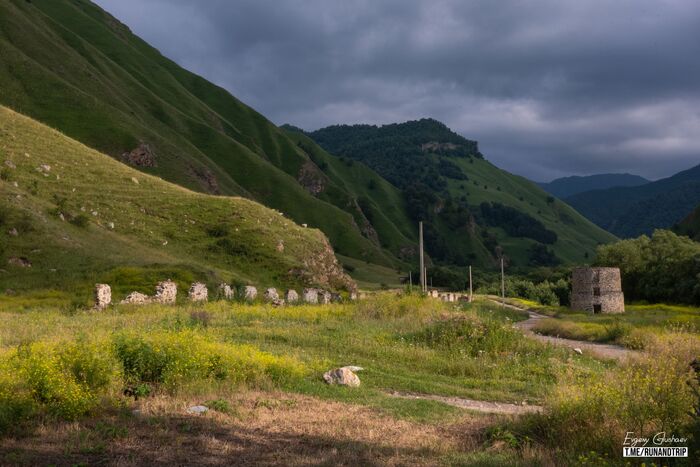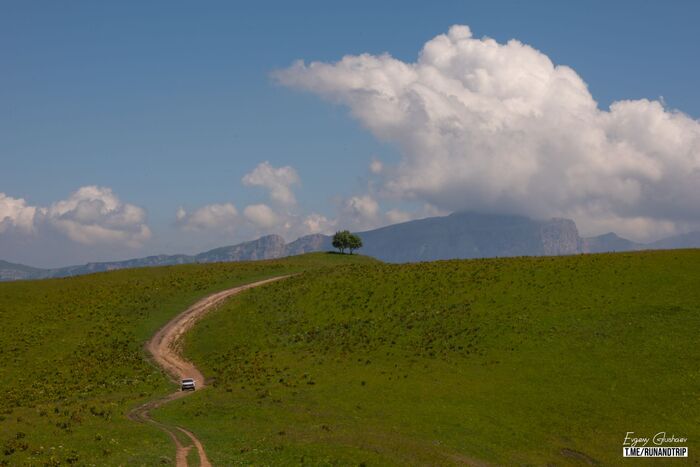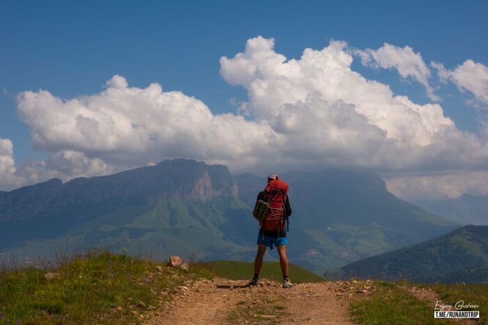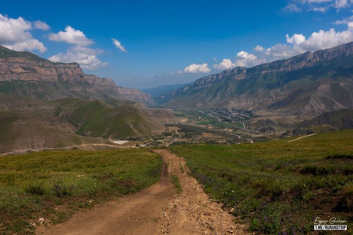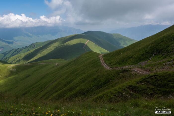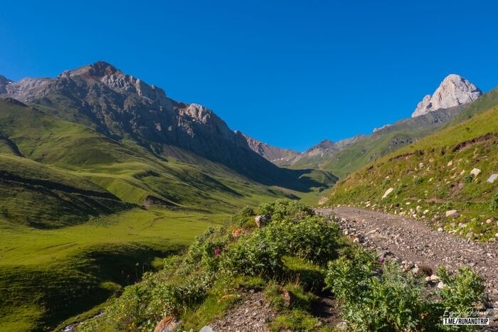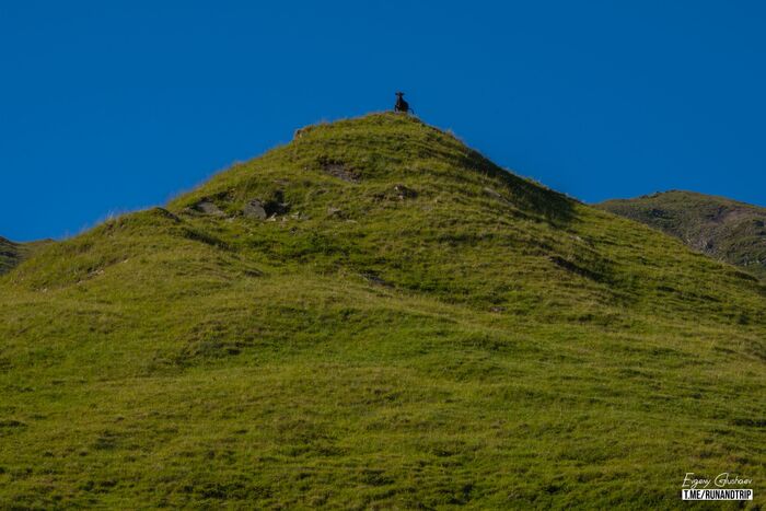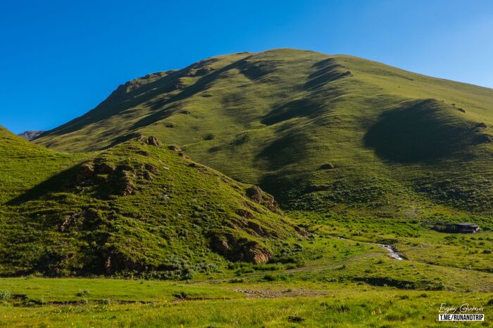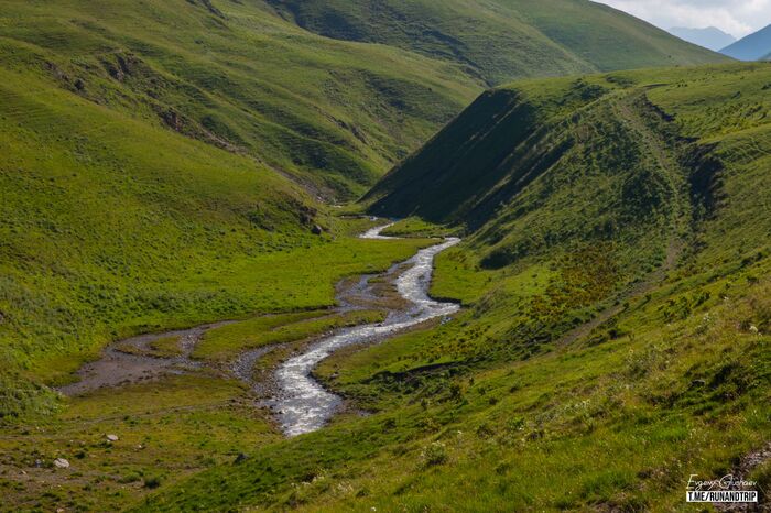 Я поблагодарил хозяина, мы попрощались и я отправился к перевалу. Здесь всё также продолжается полноценная грунтовая дорога. Она ведет в село Былым и идти по ней очень легко – никаких резких наборов и спусков. А вокруг зелёные ровные луга да река. Даже цветы почти не попадаются, только коровки и лошадки бегают вокруг. Такая вот идиллия. На одной из вершин я заприметил здорового быка, наблюдающего за мной. Не знаю зачем он туда забрался, но видно не только людям нравится рассматривать долины с высоты. Бычок проводил меня взглядом, но так и остался на той горе.
