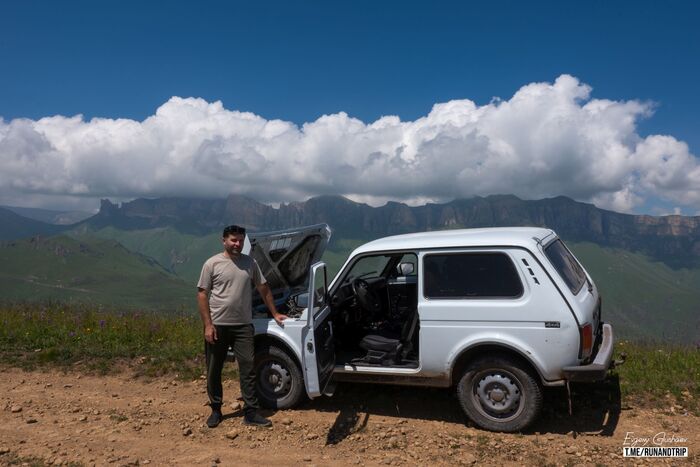 По пути встретил мужичка на Ниве. Из головы выветрило как его зовут, но он тоже путешественник, но на авто. Заезжал из Былыма в горку и машина перегрелась. В этот день температура воздуха в тени поднималась да 40 градусов. Но на перевале обдумало немного ветром и это почти не чувствовалось. Горели только подошвы у кроссовок. В ботинках было бы тоже не сладко. На машине путешествовать зачастую куда комфортнее, особенно с кондером и если машинка почти не ломается в каких-нибудь экзотических местах.