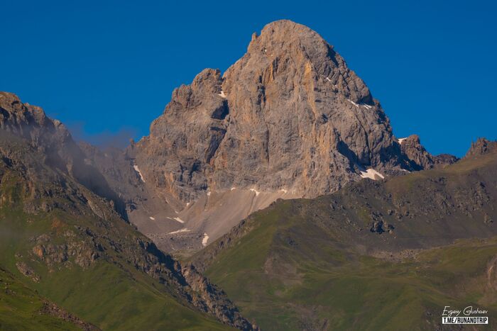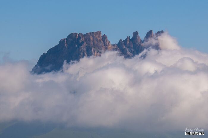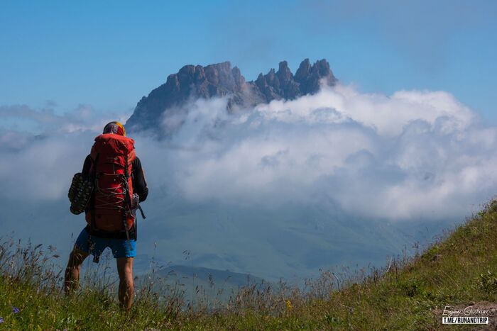 Сам перевал не высокий и вообще больше условный как минимум в сравнении с трехтысячниками, которые я тут хожу. Зато вид с него открывается хороший – причудливые вершины со всех сторон. Мне удалось определить вершину Науджидза, хоть от неё и торчало несколько скал над облаками. Смотрится волшебно! Другие же пики и вершины либо не подписаны на карте. либо их так много, что угадать какая как называется очень непросто. Гида под боком у меня к сожалению не было. Есть телефон, карты, а там крутись как хочешь!