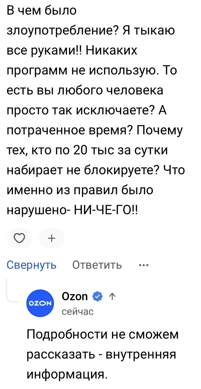 Подумала, что это знак- нужно уже спать 😂 с утра- ни одного ананаса ни в одной карточке. Пишу в поддержку- ответ в течение 3х дней. Решила пообщаться с озоном на открытых площадках. ответ убил. Мы вас исключили. Но за что- не скажем. Это внутренняя информация.