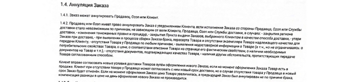 1. Право Продавца на односторонний отказ от договора-купли Продажи предусмотрено п. 1.4.2 Условий продажи товаров для физических лиц в ОЗОН.РУ.