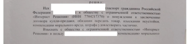 3. Взыскать с общества с ограниченной ответственностью «Интернет Решения» в пользу Потребителя компенсацию морального вреда в размере 150 000 рублей; неустойку в размере 0,5% от стоимости товара за каждый день просрочки передачи товара, начиная с 05.12.2021 и до момента передачи товара Потребителю; штраф за отказ от добровольного удовлетворения требований потребителя.