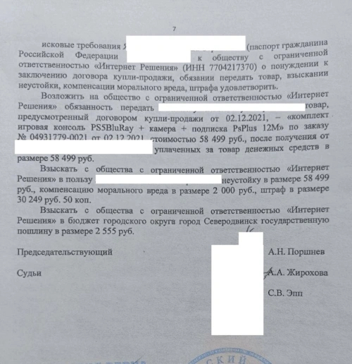 1. Обязать общество с ограниченной ответственностью «Интернет Решения» передать Потребителю товар, предусмотренный договором купли-продажи от 02.12.2021 - Игровая консоль Play Station 5 BluRay (PS5BluRay) по заказу от 02.12.2021, стоимостью 58 499 рублей