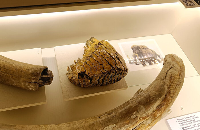 Зубы мамонта всегда выглядят внушительно. Этот из Пудожского района к востоку от Онежского озера найден в 1961 году. Для сохранности его покрыли лаком, поэтому он почти что блестит. А если бы покрыли зубной пастой «Колгейт», то сиял бы на весь зал!