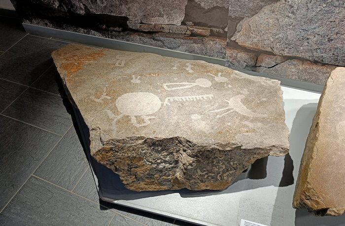 В экспозиции показывают три образца петроглифов. У этого довольно занимательная история. В довоенные советские годы сотрудникам Эрмитажа захотелось каким-то образом перенести в свои музейные фонды огромный комплекс онежских петроглифов, получивших поэтическое название «Крыша мира». Насколько захотелось, что аж кушать не могли. Поэтому взяли и взорвали скалу! То ещё варварство, ведь толком непонятно, сколько петроглифов в итоге погибло. Но, как уже сказал, всего их 4,5 тысячи, поэтому что нам, жалко, что ли... Вообще жалко.