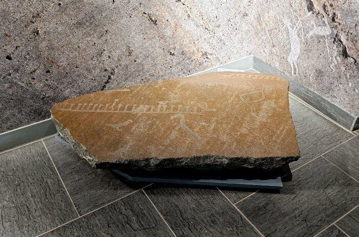 Другие два кусочка поступили в музей не так давно. Я сфотографировал один из них поближе, другой лежит правее. На этом композиция вышла интереснее: лодку мы по аналогии с «эрмитажным» петроглифом распознаем, человечков тоже увидим, а все эти круги... Это солнце и какие-то другие небесные тела? Надо срочно позвать специалистов с РЕН ТВ, точно без летающих тарелок не обошлось.