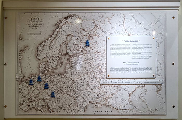 Карта показывает места курортов, где отдыхал Пётр I. Нетрудно заметить, что все они в Европе: Баден, Карлсбад, Бад-Пирмонт и Спа. Слово «бад» (нем. Bad), если что, означает ванную, купальню или в широком смысле курорт. И только одна синяя точка на карте – Марциальные воды – в России. В связи с тем, что мы посетим Марциальные воды, подробности о них будут в другой день.