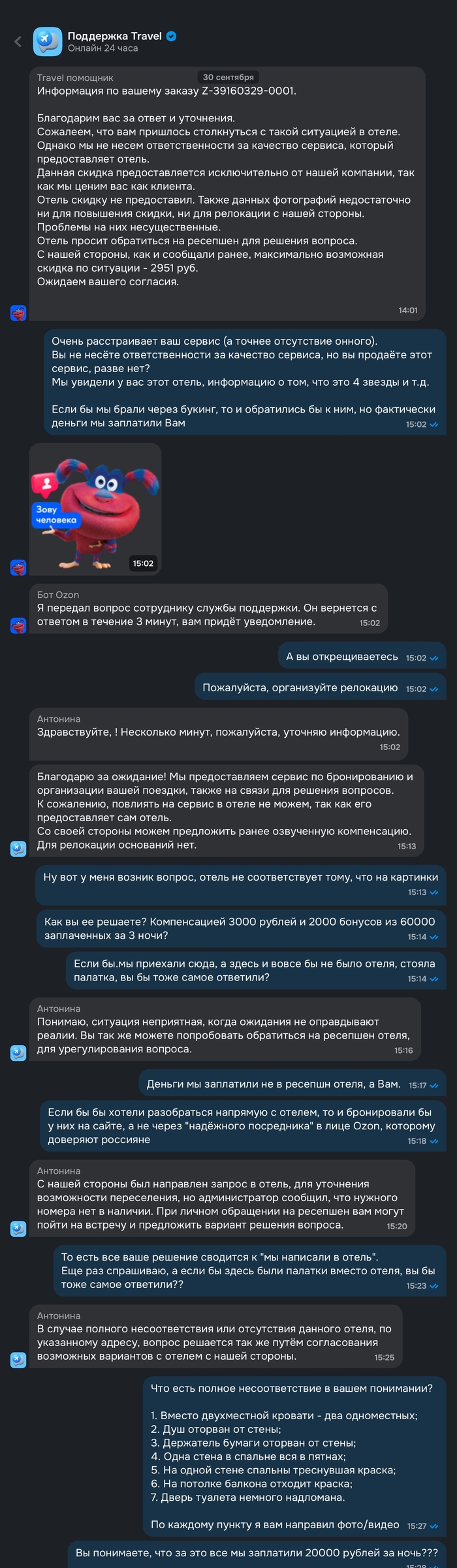 На следующий день я продолжил попытки релокации в другой отель, но это не дало абсолютно никакого позитивного результата, кроме как сваливания сотрудниками Озон вины на меня: