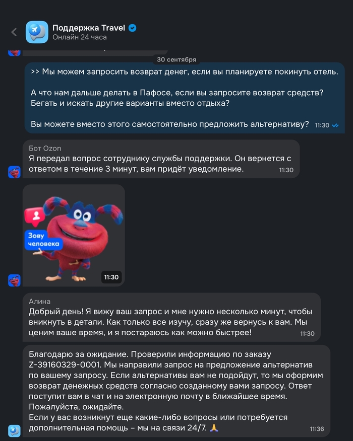 Пост без рейтинга. Прошу поддержать и поднять повыше, дабы больше людей увидело, как паботает поддержка Ozon Travel.