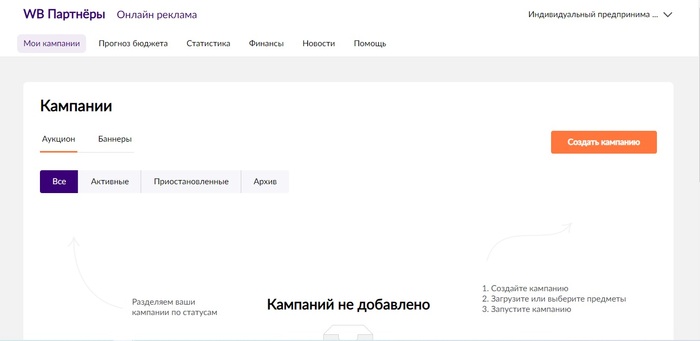 Создать кампанию - Дать ей название - Выбрать товары - Подтвердить - Активировать.