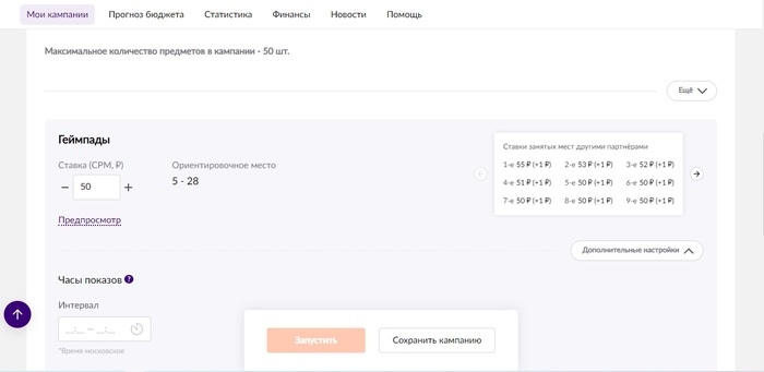 Далее, когда мы отсекли все лишнее, повышаем рекламную ставку до той позиции, на которую мы хотим попасть. Обратите внимание на фото выше, а именно на ставки - первое и второе место свыше 1000 рублей, а вот третье-четвертое уже в 2 раза меньше, всего 576. Очень часто нет смысла бороться за первые места в выдаче.