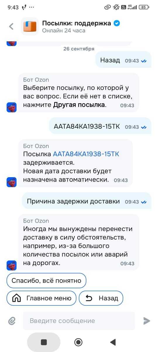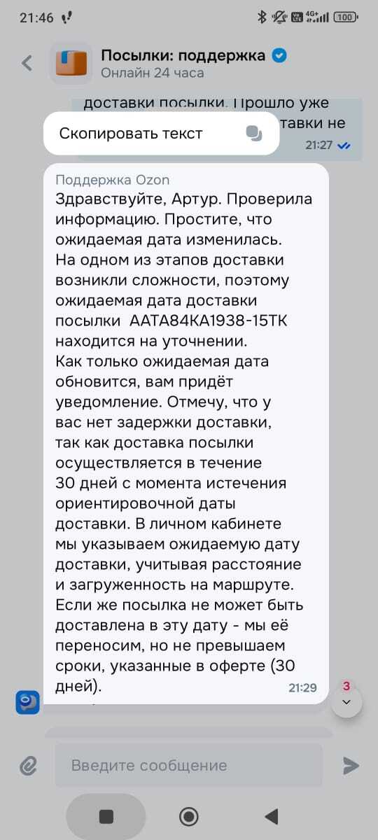 Я обращалась в «Поддержку озон» и «Посылки. Поддержка», но мне никто не помог. Посылки не отслеживаются на озон. Мне вернули 3000 руб и сообщили, что нет возможности вернуть стоимость выше объявленной ценности которую указали в посылке.
