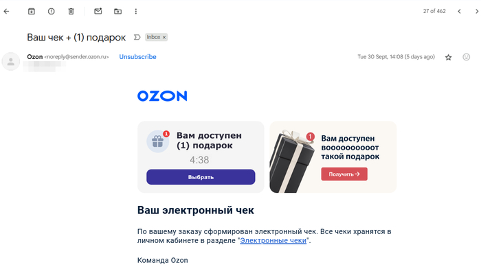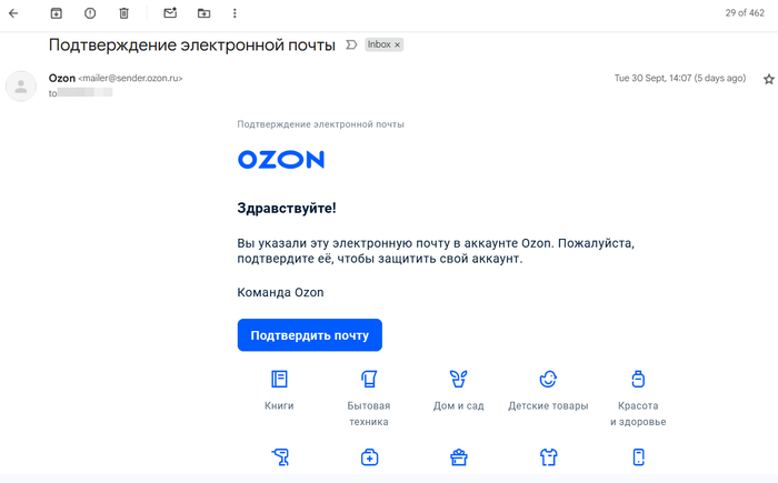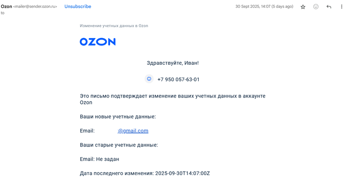 30 сентября на мой Gmail (который не используется в аккаунте Озона) приходит письмо с обращением в адрес некоего Ивана: