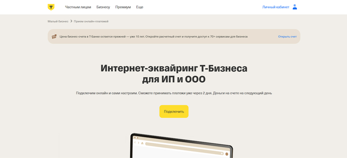 Т-Банк. Здесь есть разные тарифы и удобное мобильное приложение для контроля операций. Подключение занимает от 1 до 3 рабочих дней. Зачисление денег на счет обычно происходит в течение 1–2 дней.