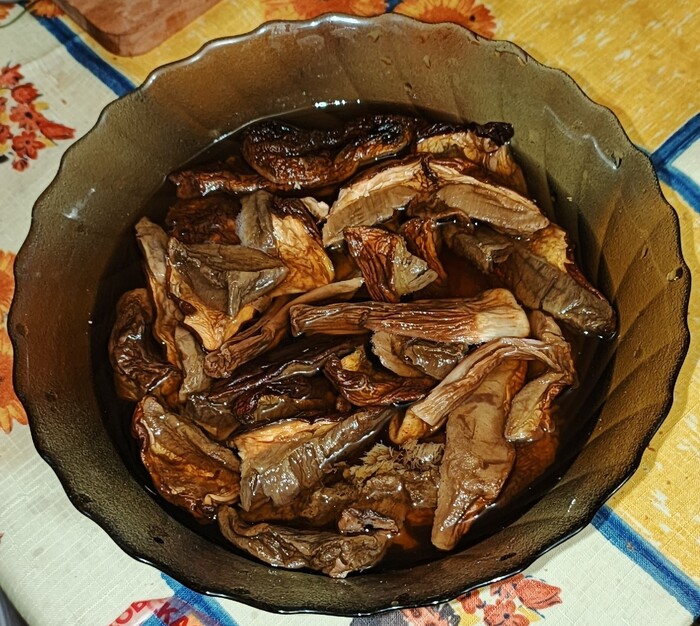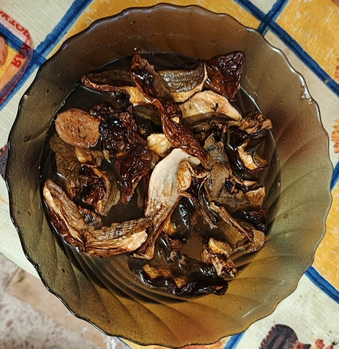 Замачиваем в теплой воде сухие грибы на 40 минут. Вынимаем, перекладываем во временную емкость, а саму первую воду пропускаем через фильтр от всяких примесей типа песка и отставляем на время. Грибы теперь заливаем снова теплой водой (60 градусов) на час полтора.