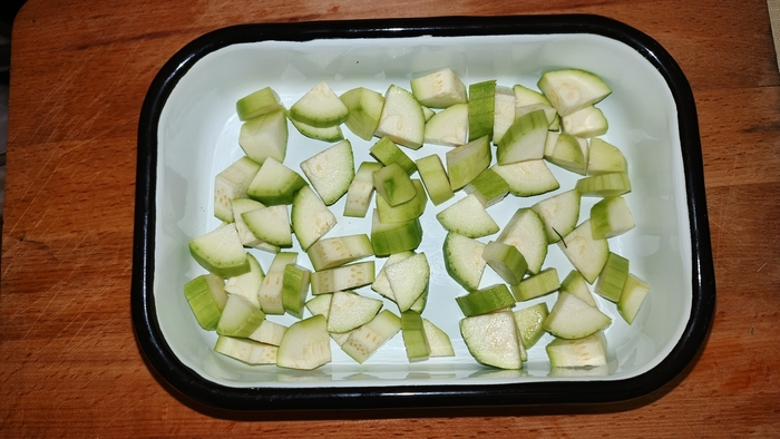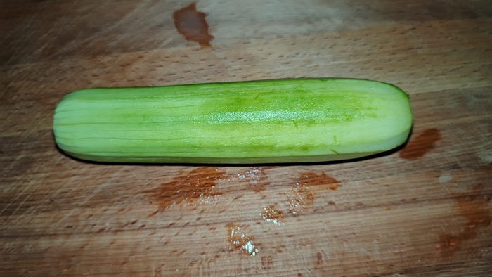 У мини кабачка обрезаем жопки, чистим кожуру, режем на четвертинки кружков