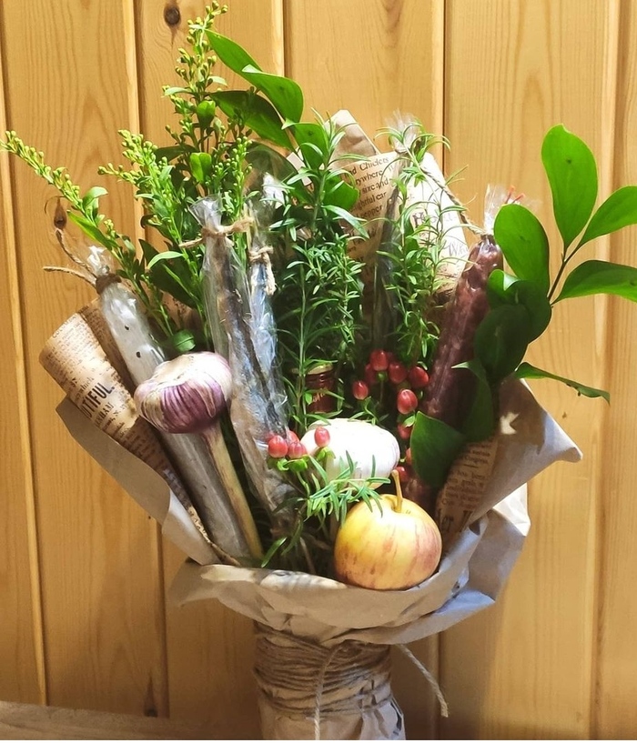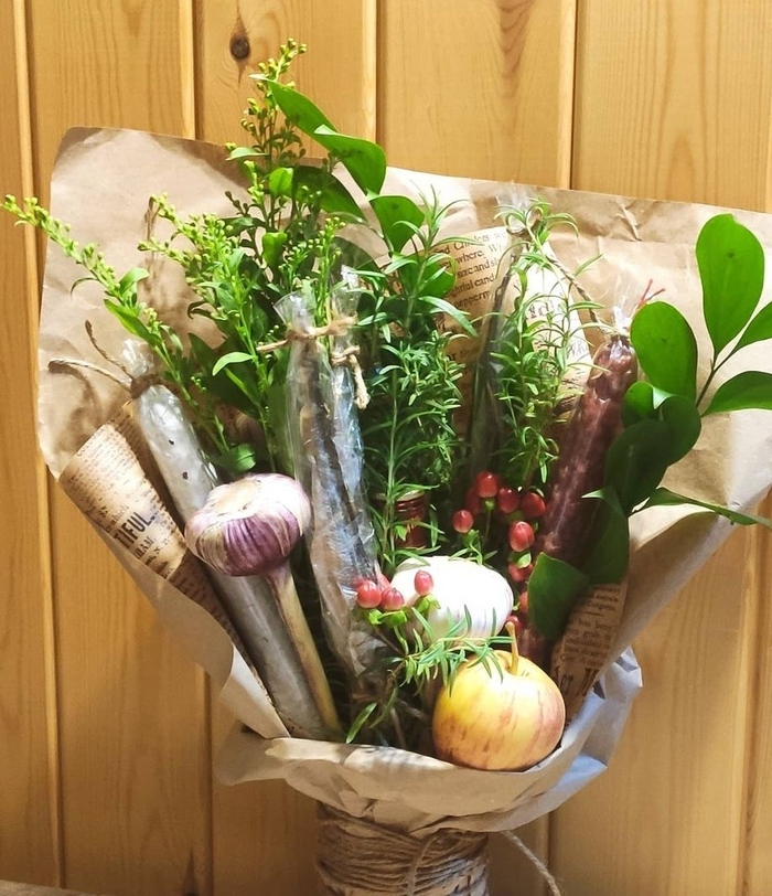 Упаковала в упаковочную бумагу, обязывала той же джутовой веревкой. Доп.расходы на букет без учёта бутылки составили 800-1000 рублей.