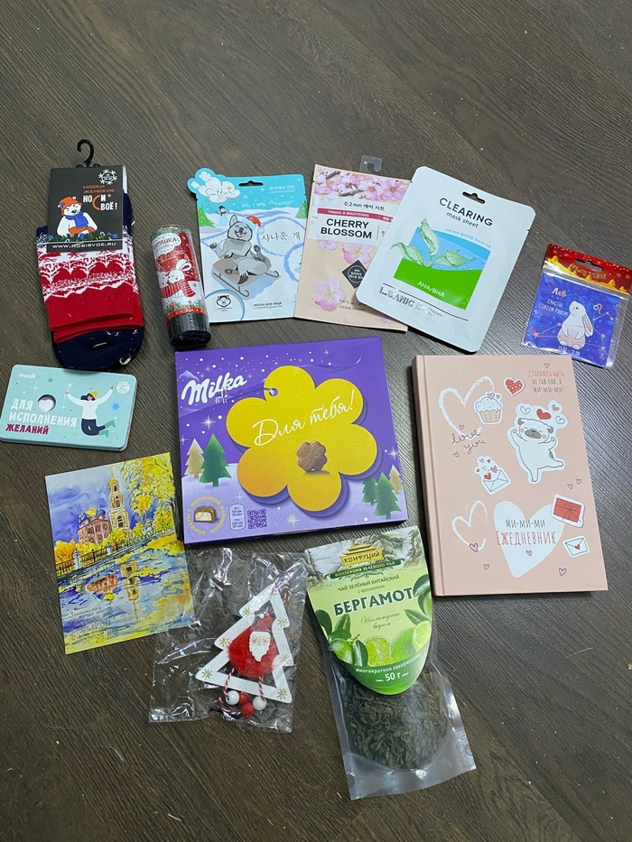 Зеленый чай, который я буду пить холодными зимними вечерами, масочки, носочки, сладости, милейший блокнот, приятные сувениры для новогоднего настроения!