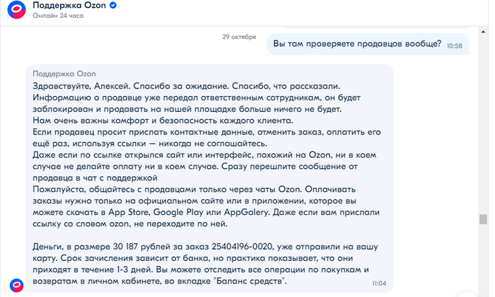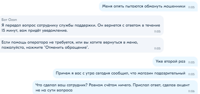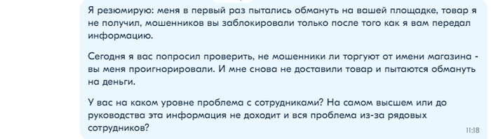 Так к чему вся эта история? Да к тому, что наши авиты/вайлдберрисы и прочие маркеты должны учиться у "загнивающего" запада, что надо быть клиентоориентированными! Вот так надо решать проблемы, а не кидать в людей отписками и заставлять общаться с ботами в надежде, что человек сам отстанет и потеряет всякую надежду на справедливость! Читаешь истории людей об их печальном опыте и понимаешь, что даже на пустом месте на любой площадке могут кинуть запросто как покупателя, так и продавца и никто не понесет ответственность за это!